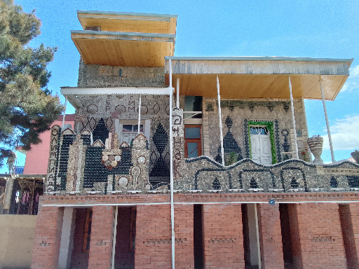 The design you see in the building was really made of bottles of different size and thickness . All togeather 48000 bottles makes this building . You need special permission to go inside of this building .